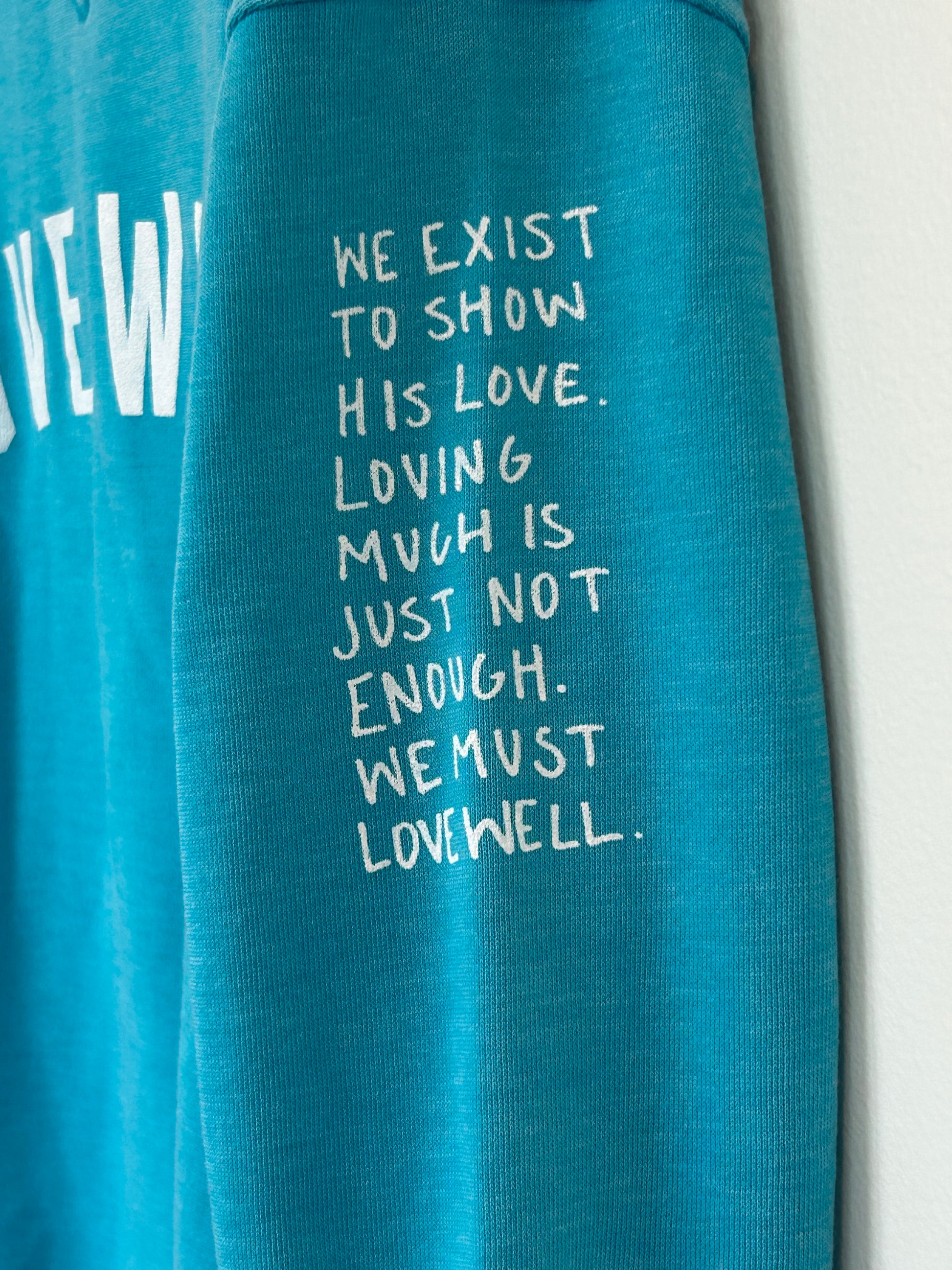 The Caribbean Blue Poncho has our vintage ivey logo on the front and our hand written message, we exist to show his love, loving much is just not enough, we must love well. on the sleeve. It combines effortless style with all-day comfort. Its mid-weight fabric and relaxed fit make it a versatile piece, ideal for layering or wearing on its own. The washed finish adds a chic, lived-in touch, making this hoodie perfect for casual outings or cozy days at home. A must-have for any wardrobe looking for that perfect mix of style and practicality. Material: 60% Cotton, 40% Polyester Screen Printed Logo