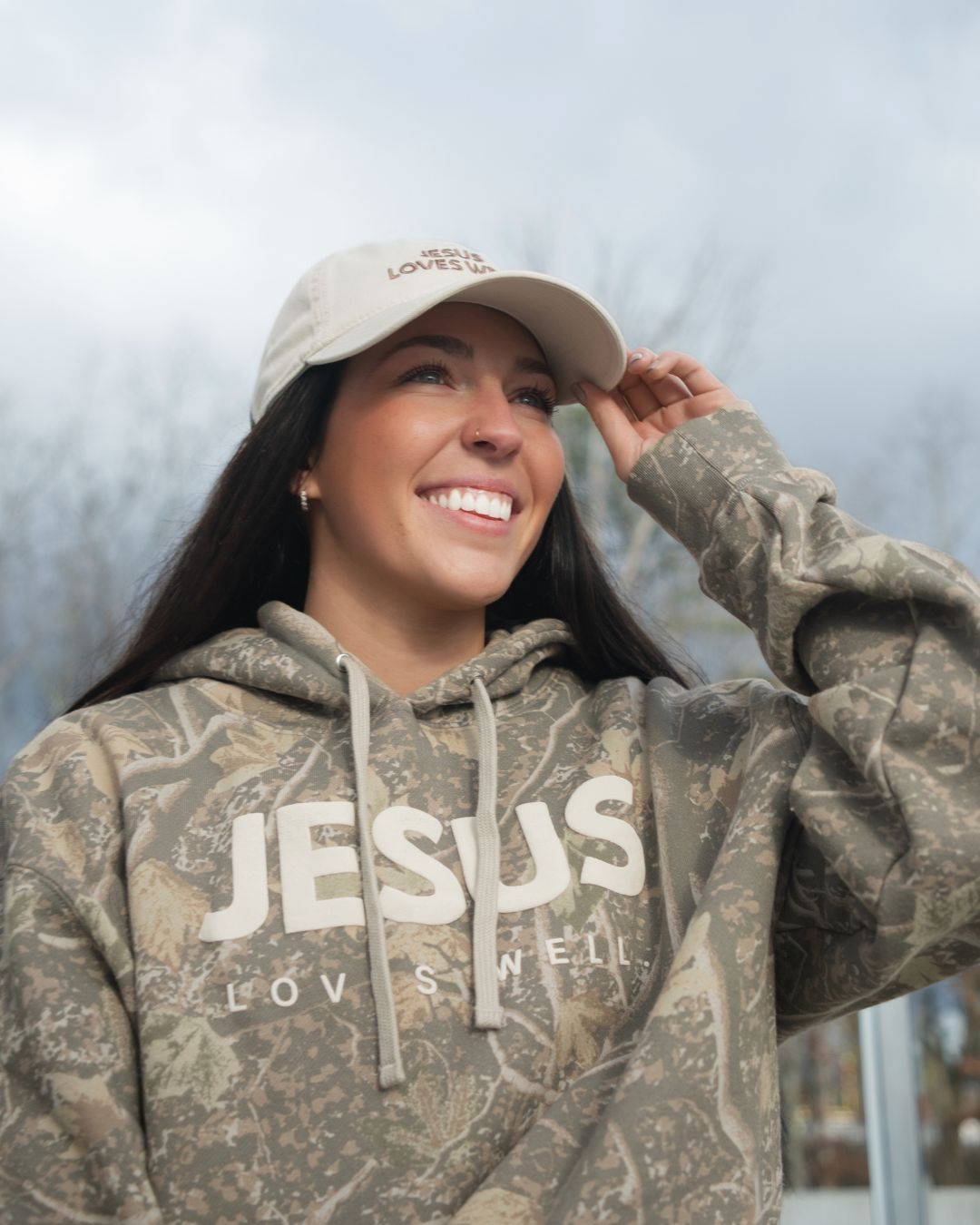 Heavy, soft, and unapologetic. Our camo base with a bold Jesus Loves Well puff print on the front. This one doesn't whisper.