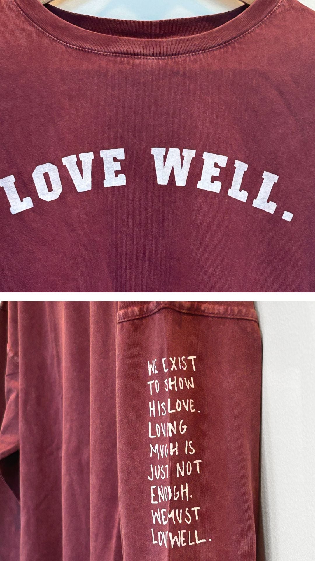 This is the softest fabric in an oversized flowing style. You'll want to live in this oversized tee. Features extreme dropped shoulder, oversized sleeves. Mineral washed fabric for a lived-in feel and look. Offered in a merlot with our vintage ivey logo on the front and our hand written message on the drop sleeve. "we exist to show is love, loving much is just not enough, we must love well"
