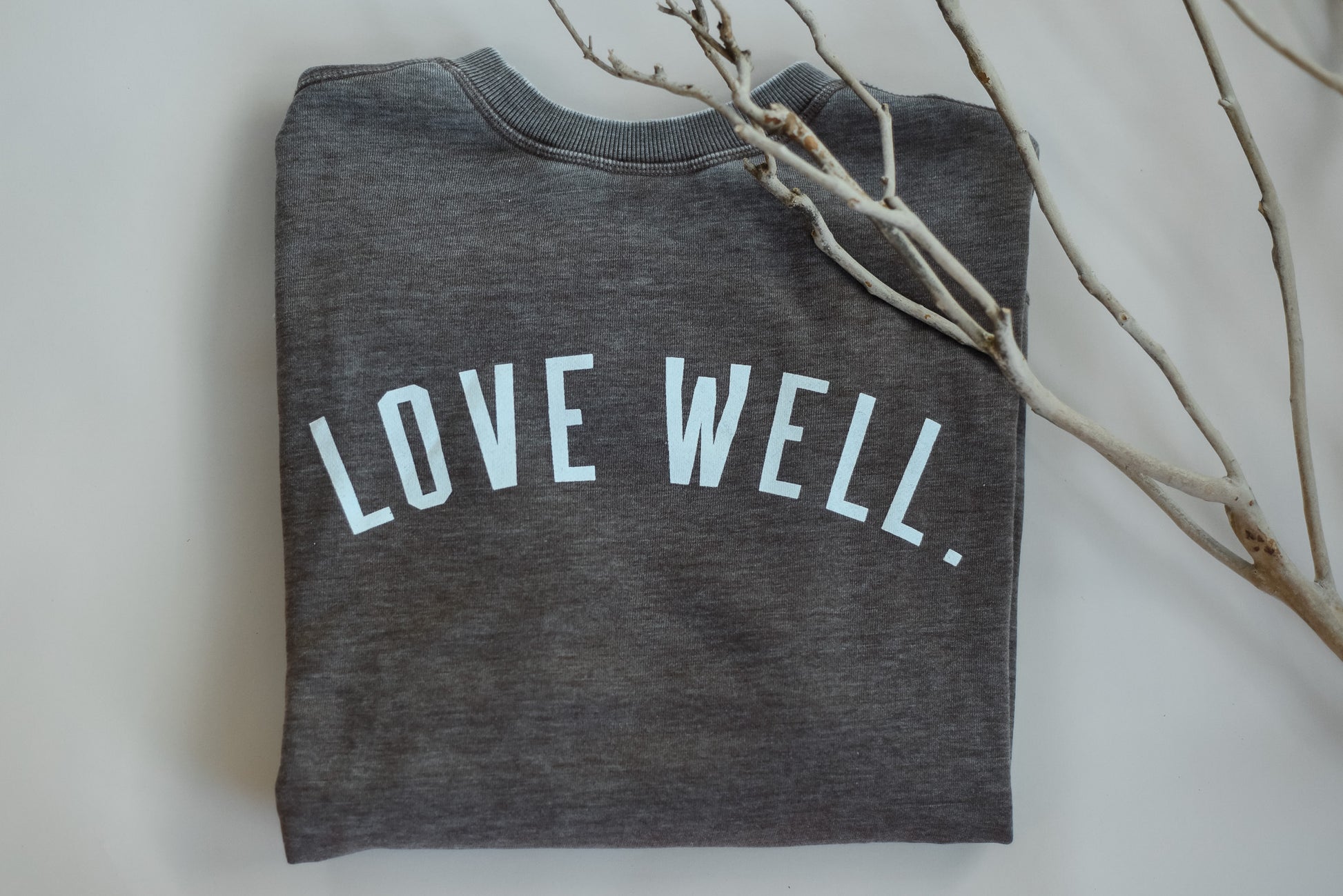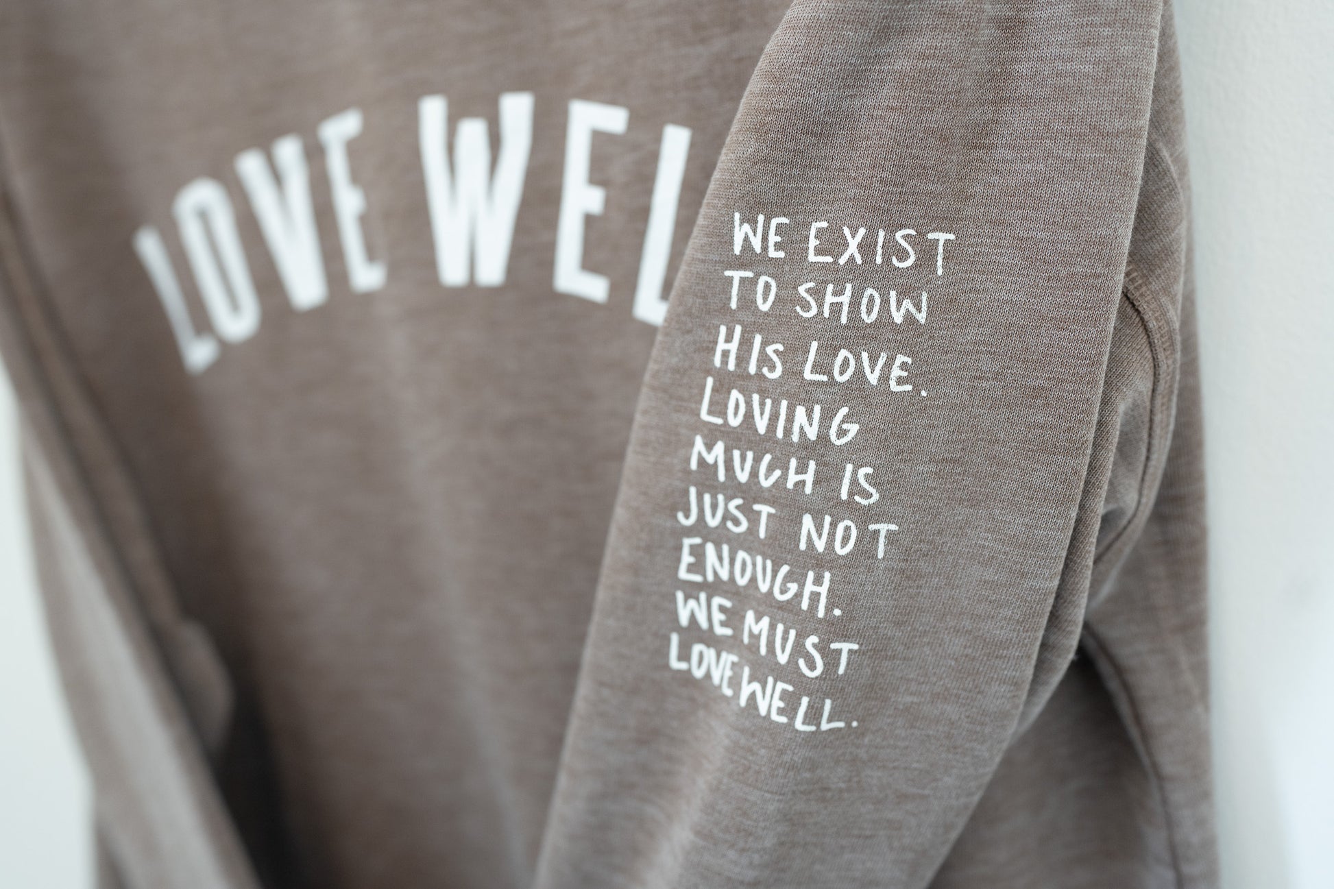 This washed chocolate crew neck is one of our classic favorites. The mid weight fabric is amazing combined with it's relaxed fit makes it the best! This one has our college logo on the front along with the embellished sleeve holding "we exist to show his love, loving much is just not enough, we must love well. The washed finish adds a chic, lived-in touch, making this perfect for casual outings or cozy days at home. Material: 60% Cotton, 40% Polyester