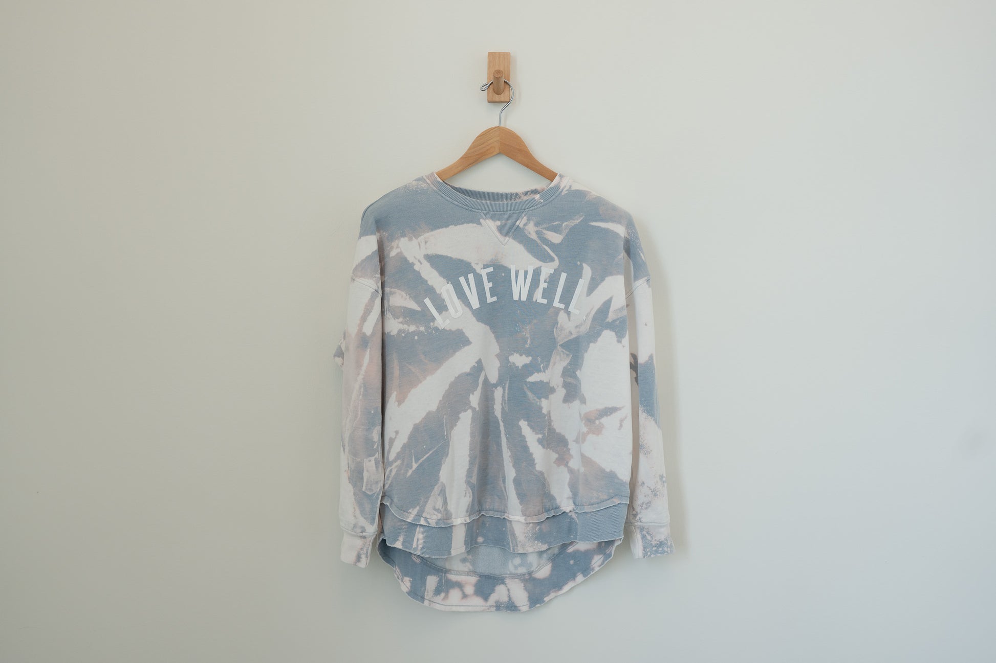 This is our most popular ladies sweatshirt with the poncho styling bottom. Longer in the back with that unfinished shirt tail design. These are each hand tie dyed and will be different variations on denim and off white and a very light pink. So fun. One of a kind for sure. A must-have for any wardrobe looking for that perfect mix of style and practicality. Material: 60% Cotton, 40% Polyester